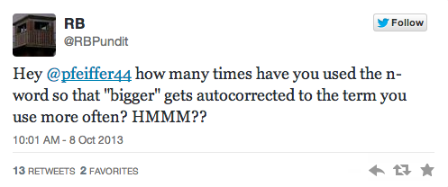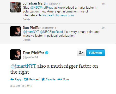 While responding to a tweet from the New York Times‘ Jonathan Martin about the rise of the Internet/cable television and how it factors into political polarization, Pfeiffer wrote: “also a much nigger factor on the right.”