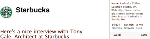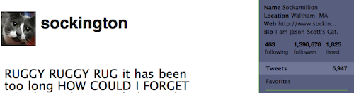 Winner: Sockington, with 1,390,678 followers. Starbucks plays the social media game well — Ad Age named them the #6 social media brand of 2008 — but Sockington has them licked: he has more than twice as many followers. How can you resist those big round eyes?