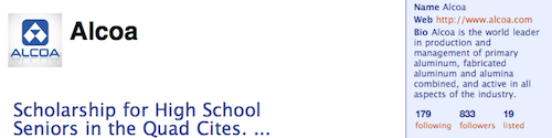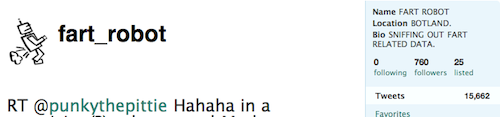 Winner, barely: Alcoa, with 833 followers. From the source itself: “RT @Flybridge_Zaya I just farted mad loud in class lolz. FART ROBOT APPROVES.”
