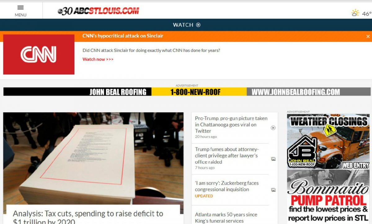 In order to promote the video, Sinclair is utilizing its affiliates’ websites, placing banner ads at the top of the pages directing viewers to their YouTube video on CNN’s “hypocritical attack on Sinclair.”