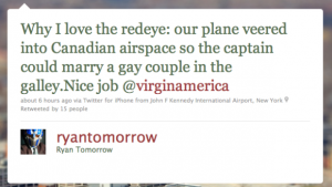 CBS News has an interesting story of a gay couple who cleverly skirted anti-gay marriage laws on a Virgin Airlines flight today. The plane’s captain briefly flew into Canadian airspace where he married the couple right there in the sky.