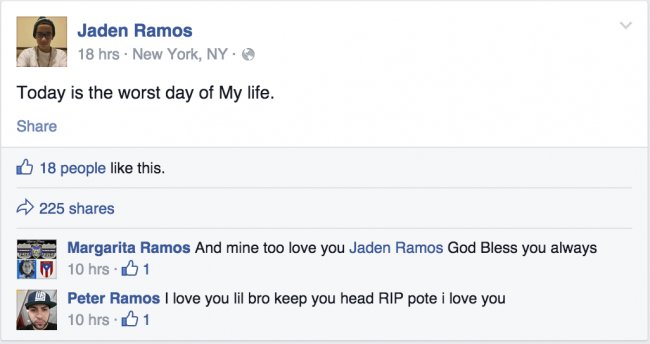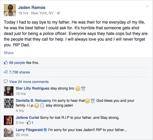 Jaden Ramos, the son of slain NYPD Officer Rafael Ramos, took to Facebook to mourn the loss of his father in yesterday’s execution-style fatal shootings of Ramos and his NYPD colleague Wenjian Liu.