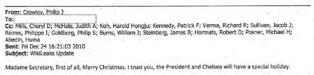 “Madame Secretary, first of all, Merry Christmas. I trust you, the President and Chelsea will have a special holiday.”