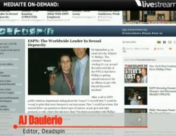After Steve Phillips‘ sex scandal broke earlier this week, one of the leading sports blogs, Deadspin.com (owned by Gawker Media), felt personally slighted by the New York Post story after feeling mislead by ESPN PR the month before. So they began publishing other tips, unverified unconfirmed, about ESPN employee sex scandals.