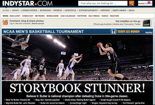 Some poor sports editor in Indianapolis isn’t just bummed that his or her local team Butler University came up a tad short last night. He or she is also probably not eager to field a bunch of questions today about prematurely publishing a story on IndyStar.com that claimed that Butler had actually won the national championship. (Oh by the way, Butler lost to Duke.) In other news, “Dewey Defeats Truman!” jokes will be a trending topic in the coming hours.