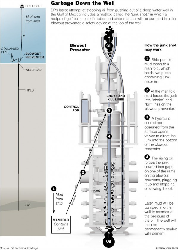 So what is the “junk shot” exactly? It may sound like a weird local news anchor slip-up but in fact it’s BP Oil’s latest attempt to stop the gushing oil leak in the Gulf. The New York Times posted a graphic yesterday that explains how exactly the company intends to use golf balls, rubber, human hair, and other bits of “junk” in order to plug the hole (Jon Stewart’s explanation is here).