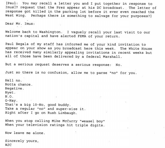 With the new release of 90s-era Clinton documents comes this gem from President Bill Clinton’s communications department. It’s a letter that the team, including current CNN contributor Paul Begala, apparently drafted but never sent to radio host Don Imus rejecting an invitation for the president to appear on his show.