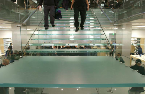 Now, if I were commissioning the interior of any kind of store and someone brought me blueprints including glass staircases, I’d tell him to take a hike. I wouldn’t give him a second shot. If he’s not intuitive enough to grasp that women in skirts will be uncomfortable walking upstairs, clouded glass or not, then what other errors has he made in his design?