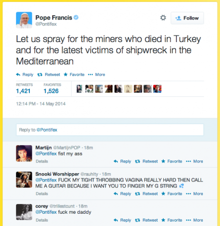 So… when the average joe accidentally makes an x-rated Twitter typo, nary a peep from the internet. But when someone as important as Pope Francis makes one, the internet cesspool trolls emerge in droves.