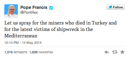 On Wednesday afternoon, the Pope sent out a calls for prayers for the 200+ miners who died in a Turkish coal mine and the 14+ dead in a Mediterranean shipwreck. But it had one little typo [UPDATE: Tweet now deleted, screengrab added]: