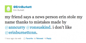 And then, as always, there’s Twitter’s role in this increasingly strange story: In response to the media attention surrounding Suskind’s mistake, a new @ErinBurkett account has been created. And, evidently, @ErinBurkett is no great fan of @ErinBurnettCNN: