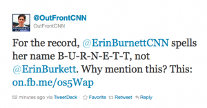 Then, on the Today, co-host Ann Curry corrected the spelling of Burnett’s name… but mistakenly referred to her place of work as CNBC, not CNN.