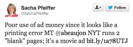 No, you’re not seeing things. If you picked up Wednesday’s New York Times, you may have noticed nothing on pages A8 and A9. That’s right, both pages were left completely blank on purpose as part of a promotion for an upcoming movie.