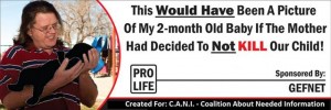 Here’s a fun way to ward off potential new girlfriends while reminding your ex why you broke up. Greg Fultz, a 35-year-old man from Alamogordo, New Mexico, was upset after his breakup with his girlfriend. So he did what any jilted lover might do: He erected a billboard broadcasting his ex’s abortion. The sign, which was sponsored by GEFNET website hosting for the Coalition About Needed Information, features a picture of Fultz at a playground, holding the outline of an infant. The accompanying text reads “This Would Have Been A Picture Of My 2-Month Old Baby If The Mother Had Decided To Not KILL Our Child!”