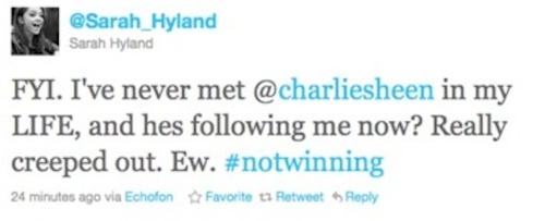 And, with that tweet, the true power of the Cult of Charlie Sheen was felt. From that small Tweet, Sarah Hyland was soon trending in multiple cities in America. Some, like TV critic Daniel Fienberg applauded Hyland. While many Sheen fans reacted…poorly. One frequently retweeted post asked Hyland if she “knew” every other one of her 36,000 followers while another simply read “Fuck you Sarah Hyland.seriously.” (I’m not linking to it, because it appears to be written by a teenage girl and, if we’ve learned anything from this story, that’s really creepy. You can find it if you feel like searching.)