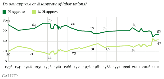 According to the survey of 1,012 random adults, 52 percent of Americans answered that they “approve” of labor unions. This figure remains relatively unchanged from the last two years, and up only a slight four percent-points from the survey’s all-time low of 48 percent in 2009.