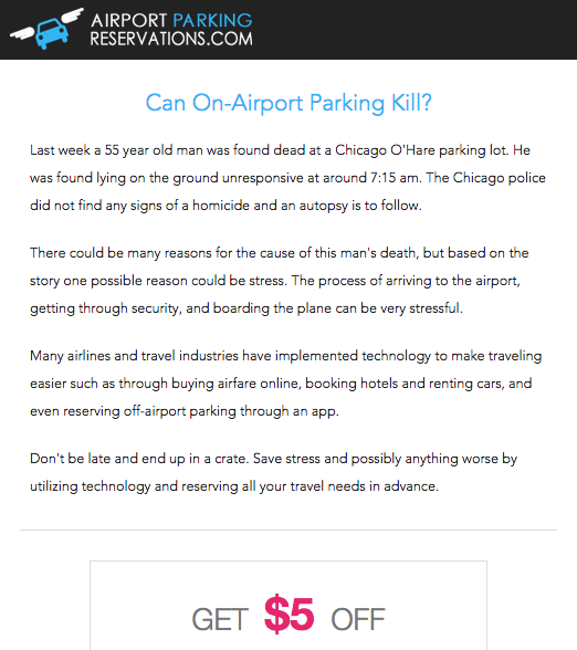 Last week, a 55-year-old man was found dead in a parking lot at Chicago’s O’Hare International Airport. Today, the website AirportParkingReservations.com sent out an email to subscribers with the subject line “Can On-Airport Parking Kill?”