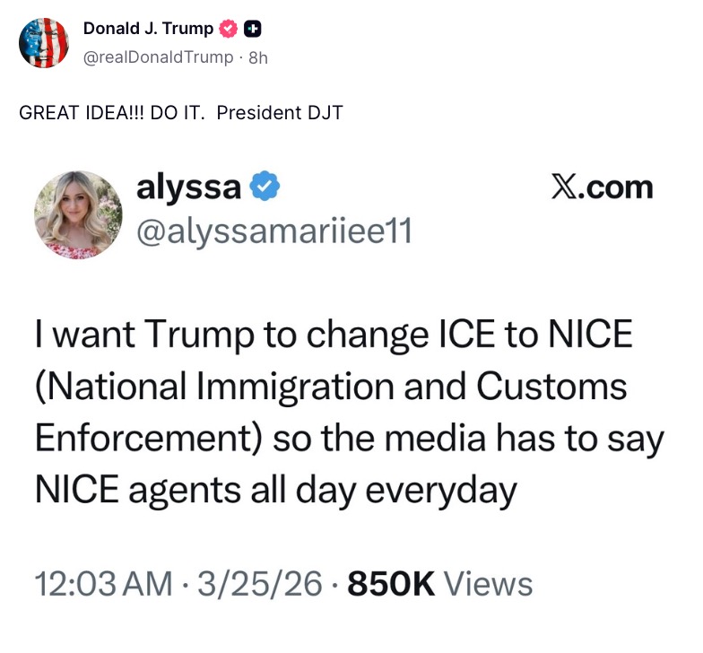 The “NICE” rebrand concept has long existed as a meme among Trump’s political base, particularly during periods of heightened criticism of ICE’s enforcement tactics.