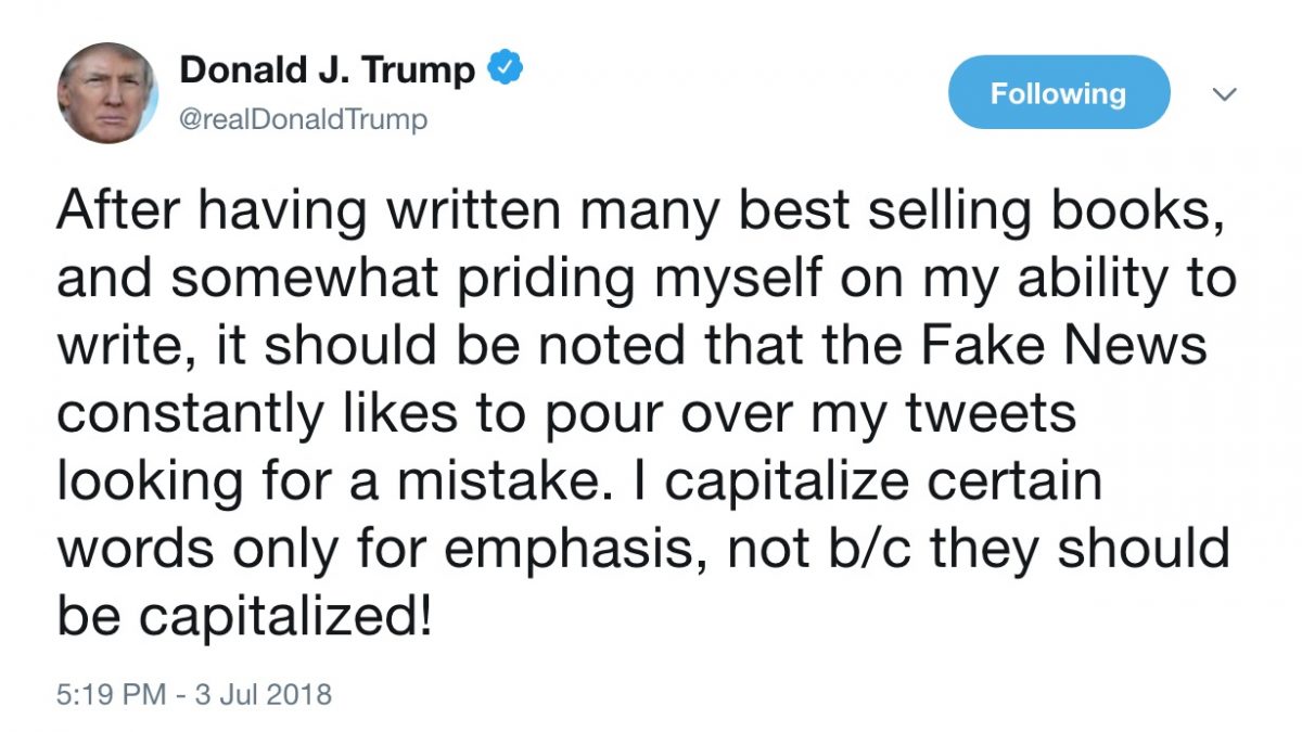 “After having written many best selling books, and somewhat priding myself on my ability to write, it should be noted that the Fake News constantly likes to pour over my tweets looking for a mistake,” Trump tweeted on Tuesday evening. “I capitalize certain words only for emphasis, not b/c they should be capitalized!”