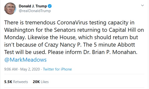 There is tremendous CoronaVirus testing capacity in Washington for the Senators returning to Capital Hill on Monday. Likewise the House, which should return but isn’t because of Crazy Nancy P. The 5 minute Abbott Test will be used. Please inform Dr. Brian P. Monahan. @MarkMeadows