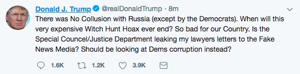 There was No Collusion with Russia (except by the Democrats). When will this very expensive Witch Hunt Hoax ever end? So bad for our Country. Is the Special Counsel/Justice Department leaking my lawyers letters to the Fake News Media? Should be looking at Dems corruption instead?
