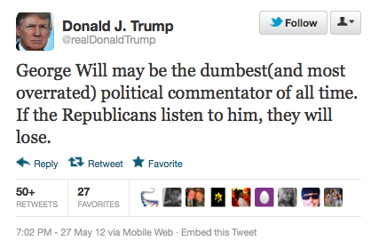 It is a pretty safe bet that at any given time a feud will be simmering below the surface of any two public figures ready to pop– the surprise often ends up being who these figures are. The latest media feud no one could reasonably have expected to erupt is the product of some comments on ABC’s This Week, where George Will dismissed Donald Trump as a “bloviating ignoramus” and advised Mitt Romney to stay away from one of his more prominent donors. Not surprisingly, these comments didn’t sit well with Trump.