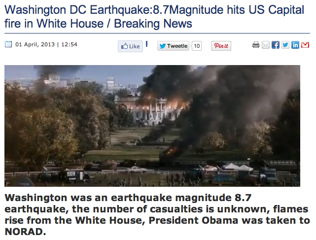 Turkish news website The National Turk may have just won the award for least funny April Fools’ prank of the day. The organization posted an article with the headline “Washington DC Earthquake: 8.7 Magnitude hits US Capital fire in White House” on its English-language site Monday afternoon, complete with a photo-shopped picture of the White House in flames. Only when readers scroll to the bottom of the article do they see the disclaimer, “This is a April Fool thank you for your understanding!”