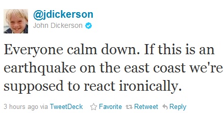 @jdickerson: “Everyone calm down. If this is an earthquake on the east coast we’re supposed to react ironically.”