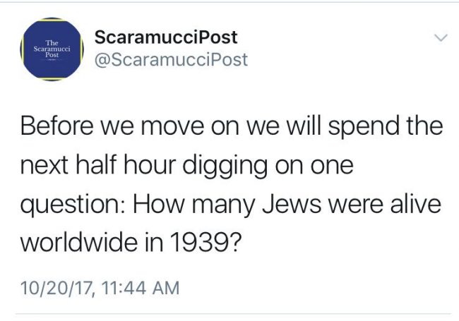 OK then. Meanwhile, Scaramucci sent out this tweet in a seeming defense of the Post’s tweets about the Holocaust and how many Jews were alive before it: