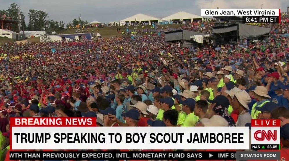 President Trump is now addressing thousands of kids at the Boy Scouts Jamboree about the “fake media” and “fake news”