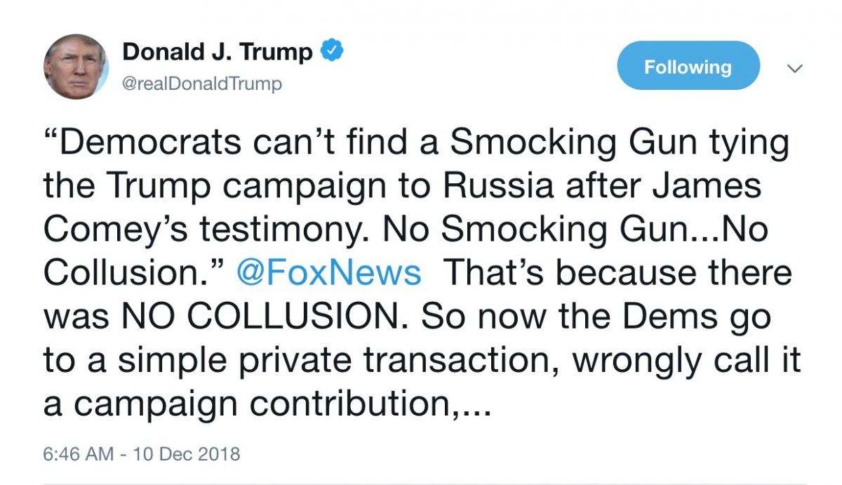 “Democrats can’t find a “Smocking Gun,” he opened the tweet, which he later followed with “No Smocking Gun.”