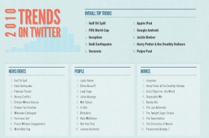 Twitter also listed the year’s top trends for individual categories, like sports and news (WikiLeaks Cablegate made it to #7), which you can check out here.
