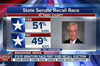 Unofficial final results updated by the El Paso County Clerk at 10:02 p.m. showed 50.96 percent of voters in District 11 wanted Morse to be recalled.