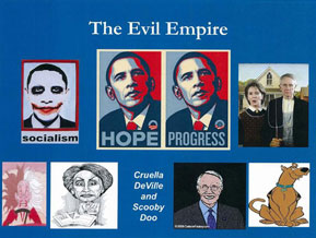 One page, headed “The Evil Empire,” pictures Obama as the Joker from Batman, while House Speaker Nancy Pelosi and Senate Majority Leaders Harry Reid are depicted as Cruella DeVille and Scooby Doo, respectively.