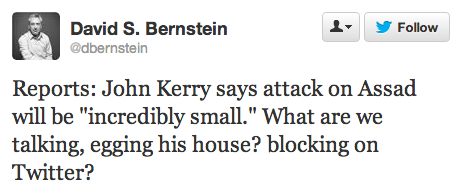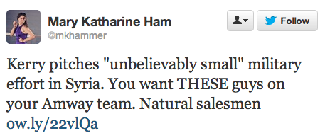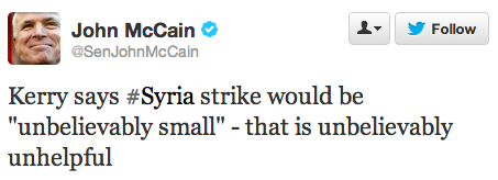 Bill Kristol slammed Kerry on Morning Joe too. Meanwhile, John McCain, one of the Republicans pushing hardest for striking Syria, had some tough words for Kerry on Twitter: