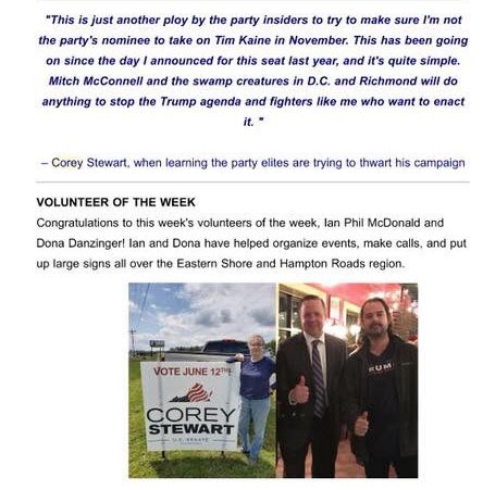 UPDATE: Corey Stewart responded to reports on his relationship with Paul Nehlen by denouncing the white nationalist figure. His campaign has not disavowed their neo-Nazi “volunteer of the week,” however. This post has also been updated to note that Stewart won the Republican primary in the Virginia Senate race.