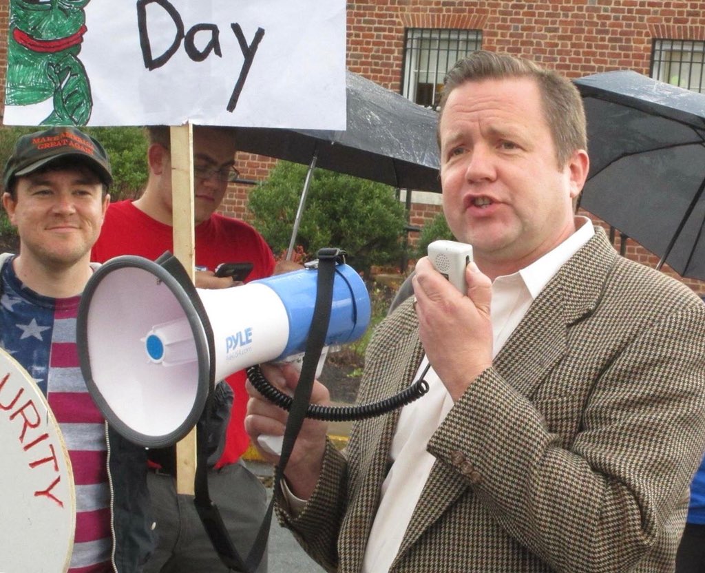 In one picture from a right-wing Charlottesville rally that occurred before the Unite The Right event, Stewart can be seen speaking on a megaphone to a crowd. Alt-right activist and white supremacist Jason Kessler, who was the organizer of the deadly rally in Charlottesville, can be spotted in the background holding a handmade poster of Pepe the Frog — a 4chan meme that was turned into a key symbol of Internet savvy white supremacists.