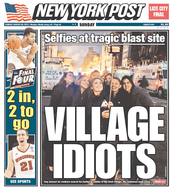 In your daily reminder to think before snapping a selfie, a group using a selfie stick before the site of the East Village gas explosion Friday wound up on the cover of the New York Post.