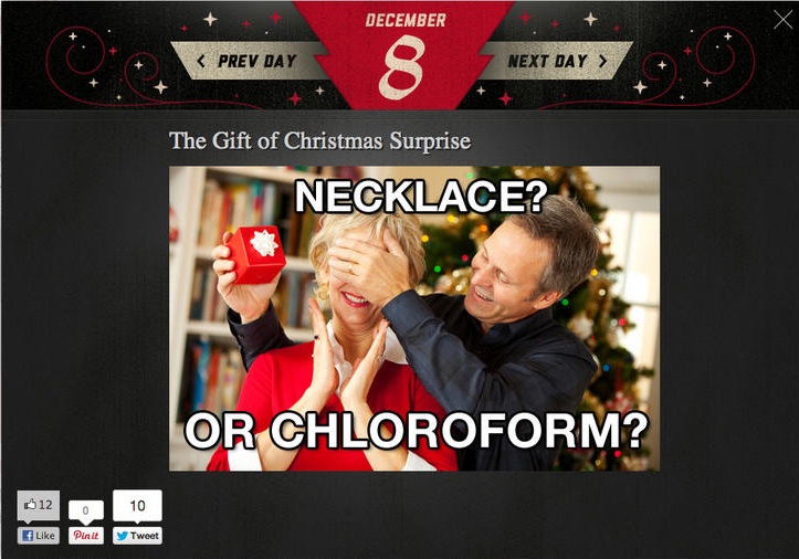 ‘Tis the season to very publicly work out your weird issues with women, if the folks at Virgin Mobile U.S. are any indication. This weekend, the mobile phone provider was the subject of a Twitter campaign aimed at a web ad that many found offensive, which caused the company to pull the offending image… and replace it with another offensive image, before killing the entire feature. Objections first arose to an entry in the site’s “The Gift Of Christmas Surprise” slideshow that featured a man covering his wife’s eyes, with an internet meme-style caption that read “Necklace? Or Chloroform?”