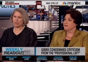 During an appearance on Chuck Todd and Savannah Guthrie‘s Daily Rundown, Washington Post columnist Ruth Marcus may have one-upped Robert Gibbs‘ “Professional Left” comments. Having already written a column agreeing with Gibbs, she told Chuck, Savannah, and Anita Dunn that the left and the blogosphere are “deranged.”