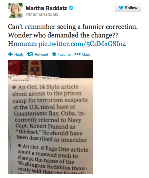 The Washington Post may have just issued one of the funniest, and most unnecessary, corrections of all time. As many close readers of the paper, including ABC News’ Martha Raddatz, pointed out, the Post informed its readers Wednesday that Navy Capt. Robert Durand should have been described as “muscular” and not “thickset.”