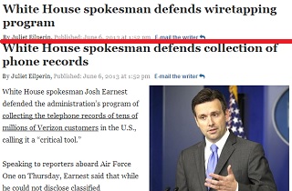 The NSA’s gathering of millions of Verizon customers’ phone records, first reported by The Guardian‘s Glenn Greenwald, has resulted in copious alarm from the news media, but at least one outlet has already begun to oversell the program. In a report on White House Principal Deputy Press Secretary Josh Earnest‘s defense of the practice, The Washington Post published a headline that said “White House spokesman defends wiretapping program,” which they later changed to the more accurate, less sexy “White House spokesman defends collection of phone records.”