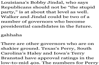 In the 16th paragraph of Balz’s now corrected piece there was a line that consisted of simply the word/phrase “gahhaha.” It comes immediately after a paragraph about the presidential chances of Louisiana Governor Bobby Jindal and Wisconsin Governor Scott Walker.