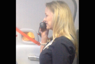 “My ex-husband, my new boyfriend and their divorce attorney are going to show you the safety features of this Boeing 737 800 series,” Cobb told the passengers, who immediately seemed to get on board with her schtick and start laughing. “Everybody gets a door prize in the seatback pocket in front of you — along with dirty diapers, chewing gum wrappers, banana peels and all other gifts you leave for us from time to time — it’s the safety information card.”