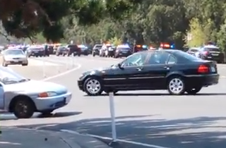 An intense new video captures a shootout between Stockton, California police and criminals after a high-speed chase following a bank robbery. The shootout left three people, all of them in the robbers’ car, dead. According to the L.A. Times, the robbers were using hostages as human shields, and threw one of the hostages in the car with them.
