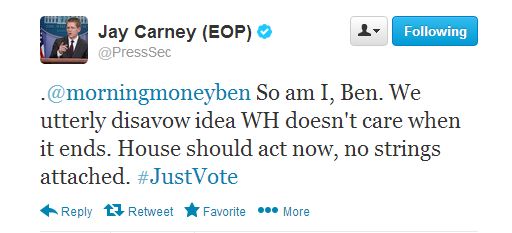 UPDATE: White House Press Secretary Jay Carney told POLITICO reporter Ben White on Friday that he is prepared to “disavow” the idea that the administration does not care when the shutdown ends because they are winning the argument with the public.
