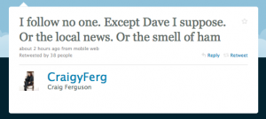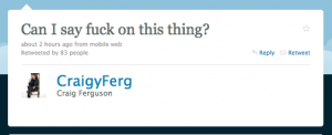 After pooh-poohing it in the past, Ferguson announced at the top of Monday night’s show that he had succumbed and was joining Twitter, tweeting up a storm during his show, wondering if he was allowed to swear, experimenting with the ‘retweet’ function, crowdsourcing, pushing his favorite show Mythbusters, and exclaiming, “God this shit is terrific.”