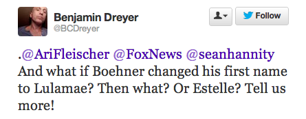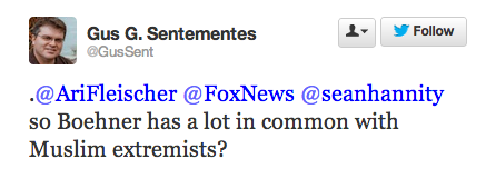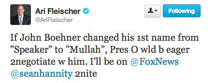 Former George W Bush press secretary Ari Fleischer, no stranger to Twitter foibles, stepped in it again on Wednesday night when he tried to hype his imminent appearance on Hannity by echoing a current GOP talking point that Obama is more willing to negotiate with hostile foreign leaders than he is with House Republicans.