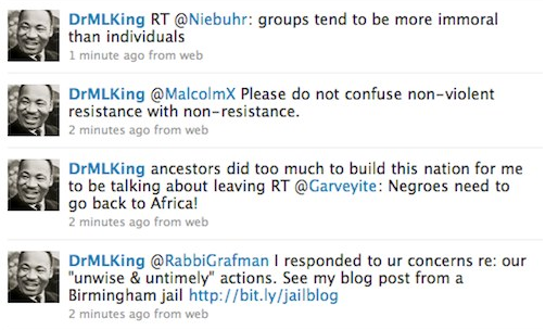 Then he goes on to imagine — in great detail — how Dr. King would have used the social networking site. Scoffers, hold your fire — it’s not a silly exercise, by a long shot. Instead, what Thurston does is skillfully demonstrate — and illustrate — just how versatile and useful that simple 140-character platform is for hosting conversations, engaging dissent, planning action, and displaying leadership. Really.