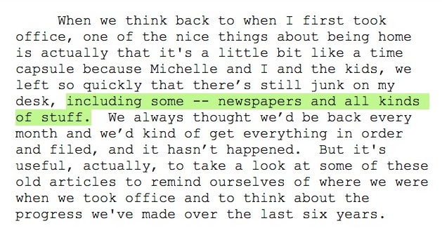 How it appears in the official White House transcript: “When we think back to when I first took office, one of the nice things about being home is actually that it’s a little bit like a time capsule because Michelle and I and the kids, we left so quickly that there’s still junk on my desk, including some — newspapers and all kinds of stuff.”